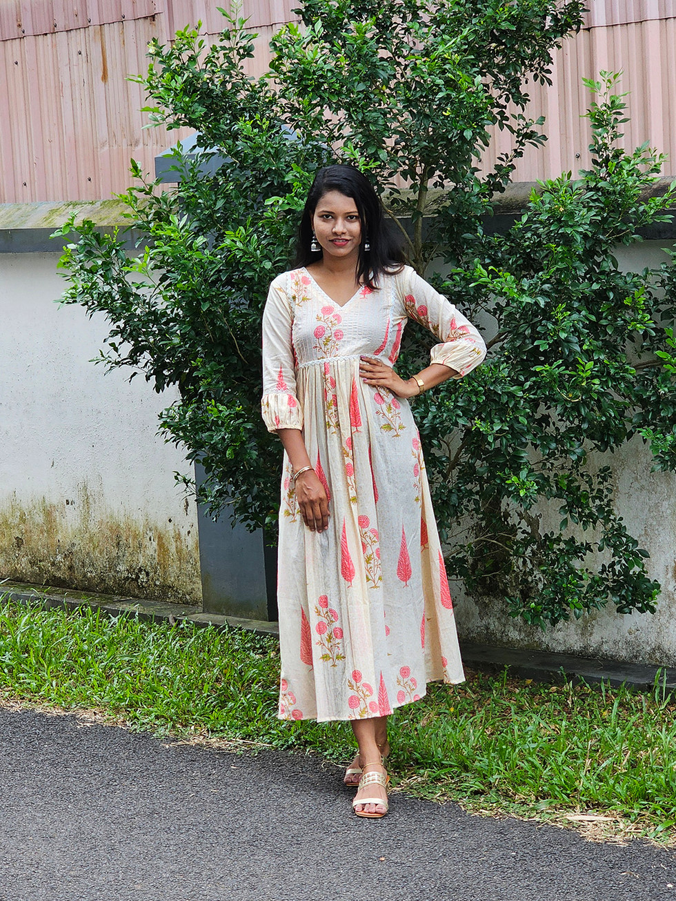 Step into effortless grace with our Floral Elegance Cotton Maxi Dress, a perfect blend of comfort and charm. Crafted from soft, breathable cotton, this ankle-length dress features a flattering empire waist and V-neckline that enhances your natural silhouette. The cream base is beautifully adorned with delicate pink floral prints, giving it a fresh and feminine touch ideal for casual outings, brunches, or weekend getaways.