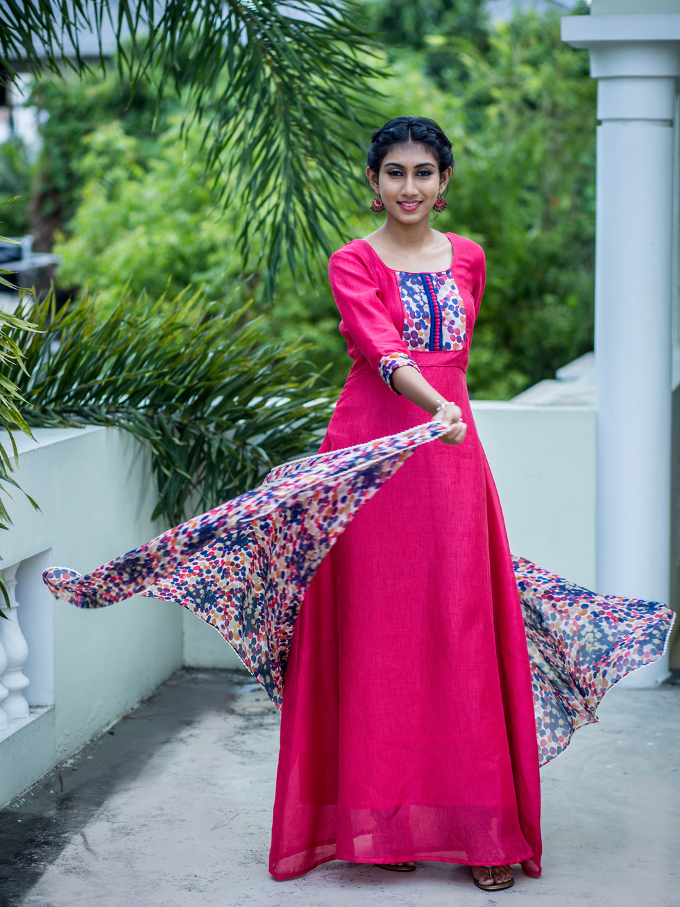 Elevate your dress collection with the Fuchsia Polka-Dot Yoke & Scarf Maxi Dress—where vibrant color meets playful print for an unforgettable style statement.
